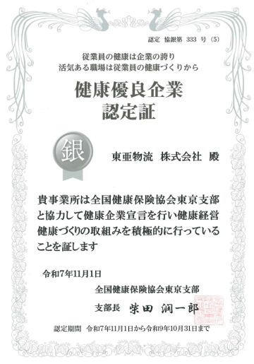 令和7年11月1日付にて、全国健康保険協会東京支部より、継続して健康経営の取組みを積極的に行っている事が評価され、健康優良企業の「銀の認定」を更新する事ができました。令和2年に取得して以降、今回で5回目の更新となります。今後も認定の更新は勿論のこと、戦略的に健康経営を推進して「働きやすい職場作り」をする事で、求職者から選ばれる企業になれるように邁進いたします。
